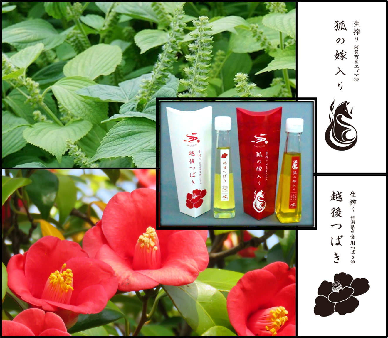 この製法で作り上げた北越ファーム自慢のえごま油「狐の嫁入り」とつばき油「越後つばき」をぜひ、ご賞味ください。健康に良い天然オイルを気軽にたのしみませんか?サラダのドレッシングやお味噌汁への添加など、美味しく体を健康に。